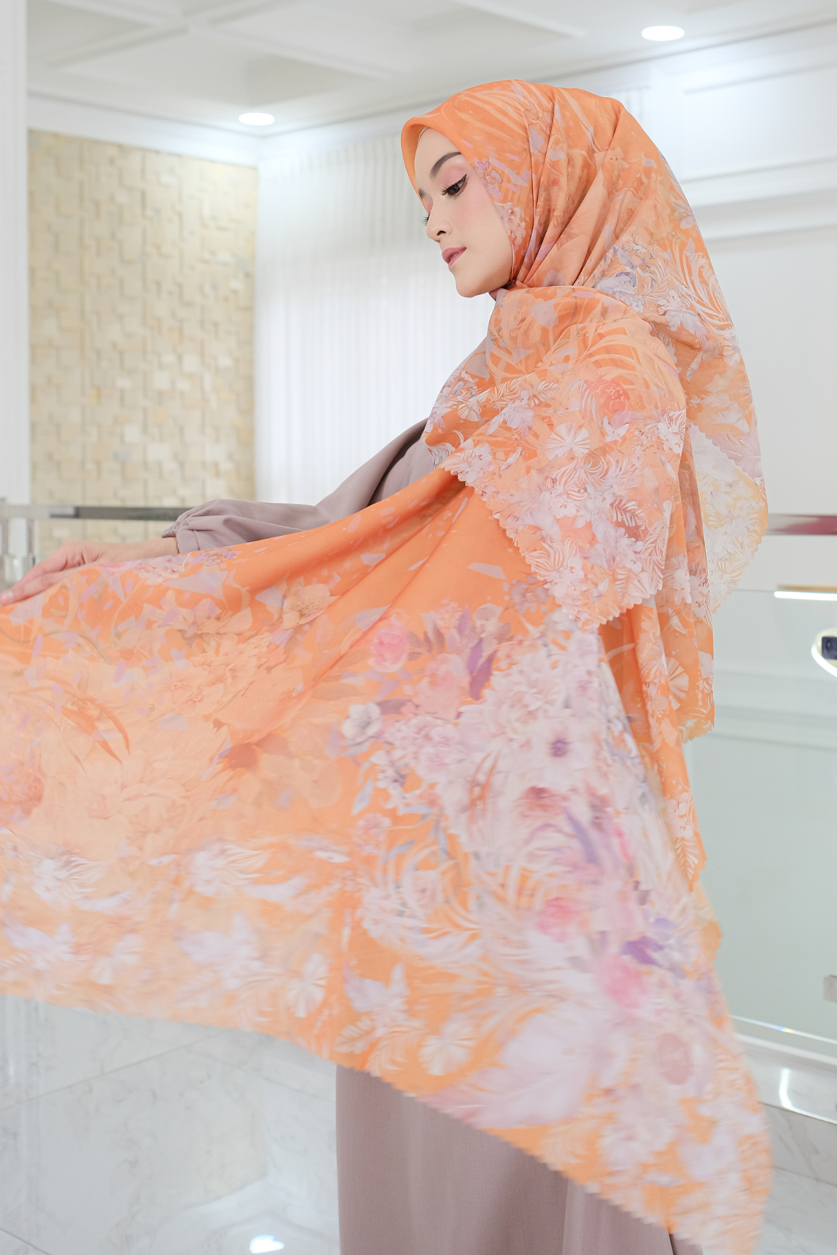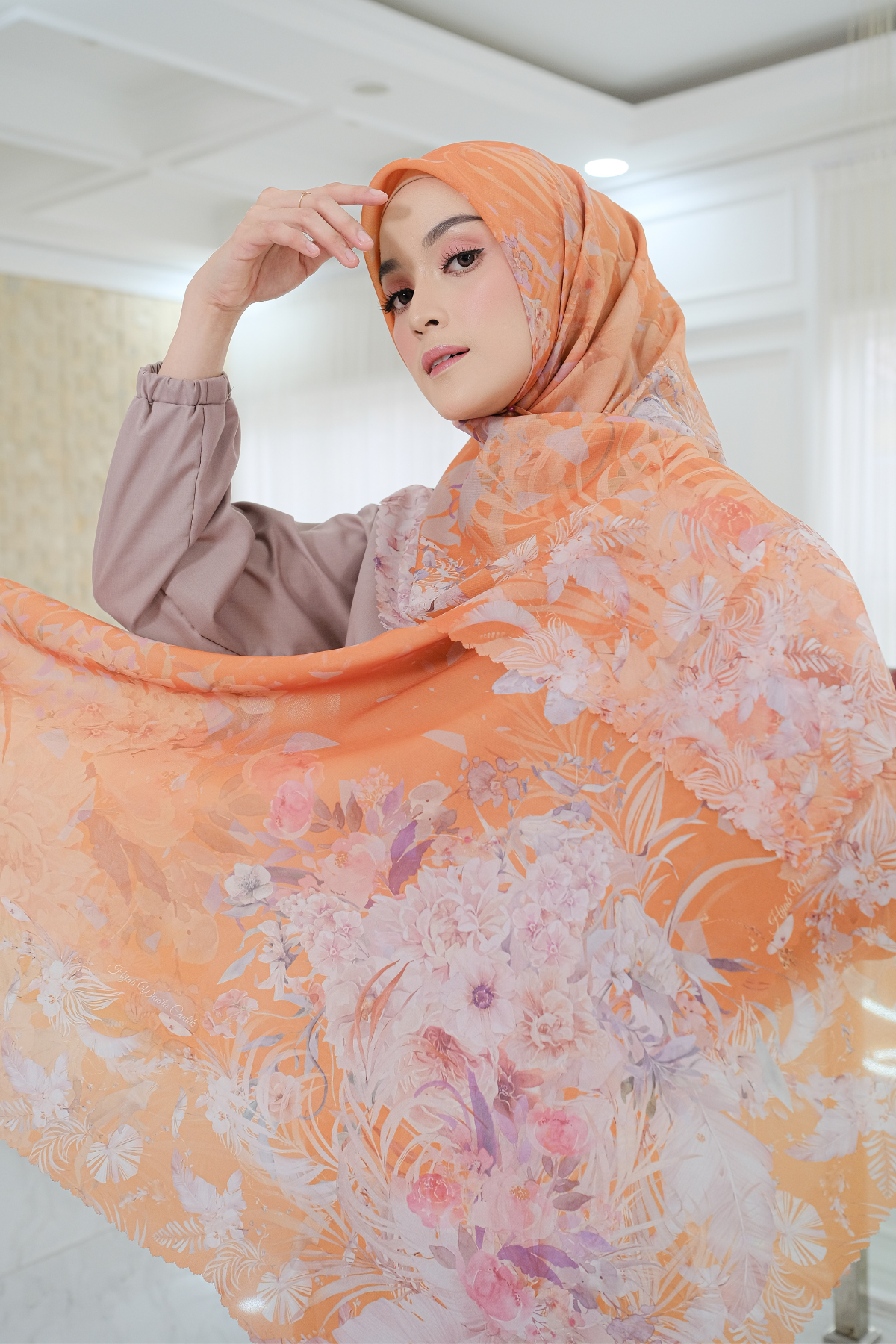 Hijab printing dengan motif exclusive Emily Series yang terinspirasi dari tema vintage garden yaitu nuansa keindahan bunga-bunga di taman dengan dekorasi klasik yang memukau. Dengan perpaduan warna-warna pastel yang lembut serta motif bunga yang sangat beragam menggambarkan rangkaian aneka bunga yang tertata cantik di taman. Pada bagian tengah scarf terdapat ornamen-ornamen abstrak dengan warna yang menyatu dengan warna dasar, sehingga memberi kesan clean dan elegan saat dipakai.