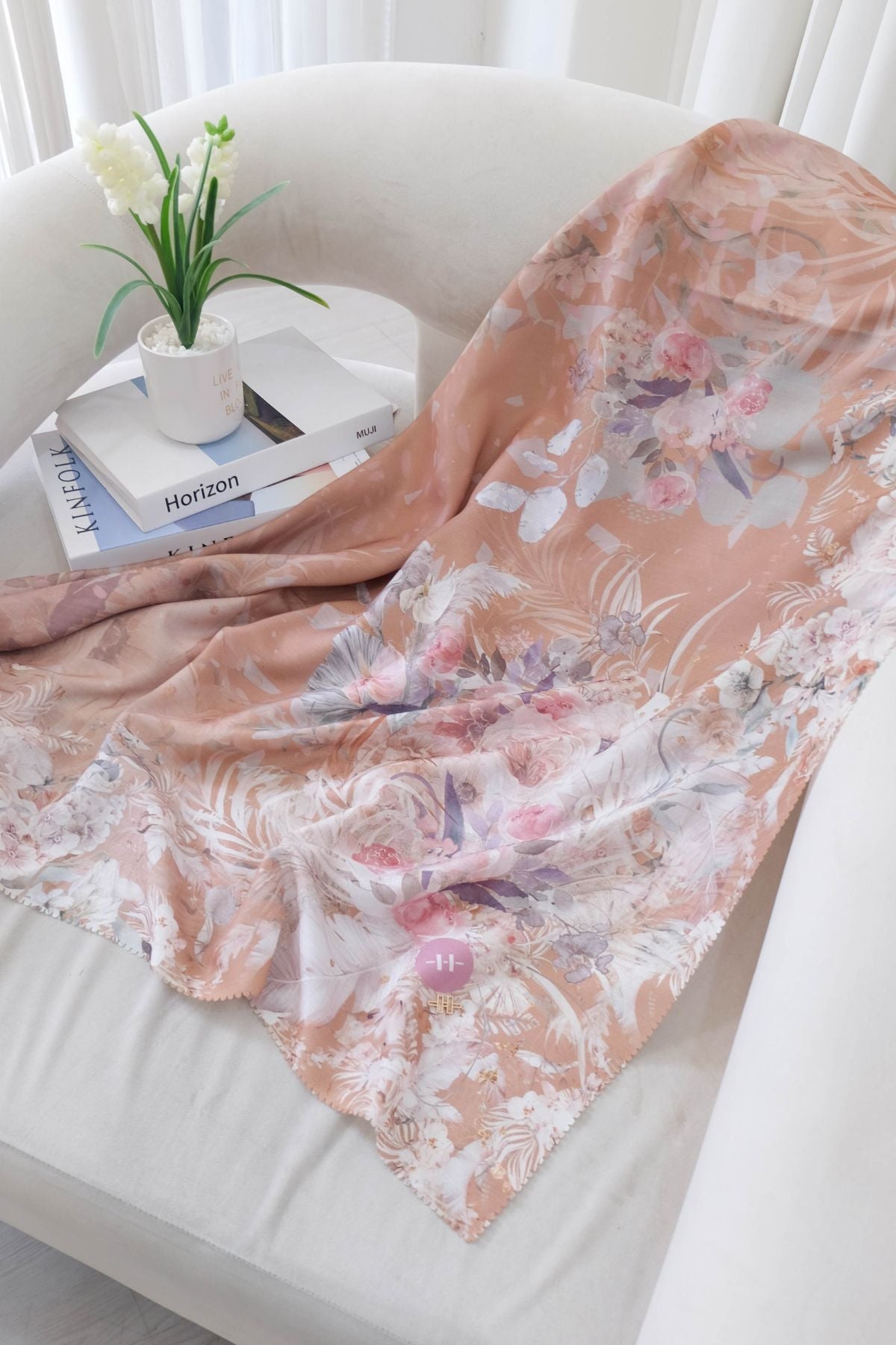 Hijab printing dengan motif exclusive Emily Series yang terinspirasi dari tema vintage garden yaitu nuansa keindahan bunga-bunga di taman dengan dekorasi klasik yang memukau. Dengan perpaduan warna-warna pastel yang lembut serta motif bunga yang sangat beragam menggambarkan rangkaian aneka bunga yang tertata cantik di taman. Pada bagian tengah scarf terdapat ornamen-ornamen abstrak dengan warna yang menyatu dengan warna dasar, sehingga memberi kesan clean dan elegan saat dipakai.