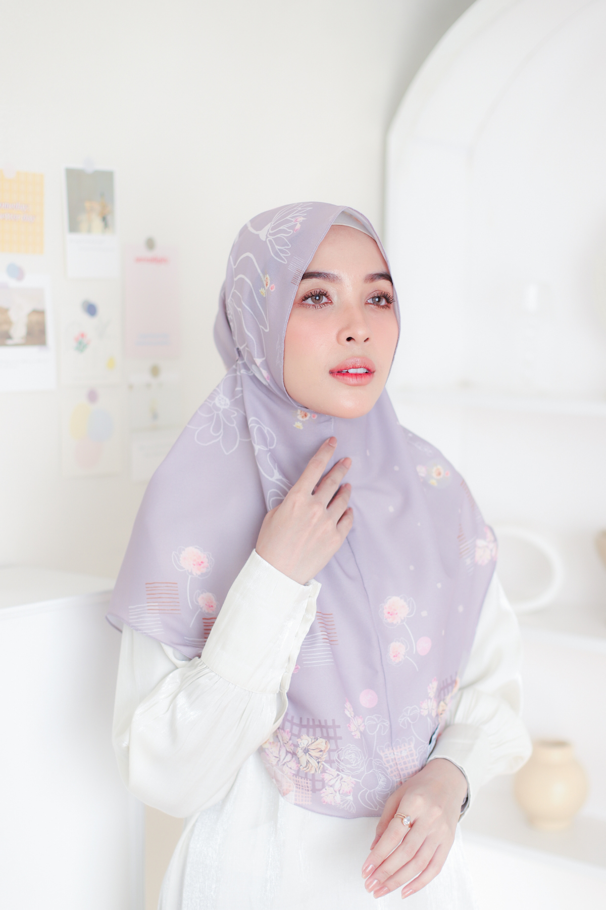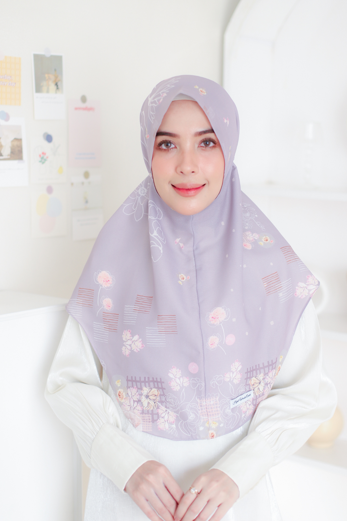 Hijab printing dengan motif Mora Series yang berarti manis, terinspirasi dari manis dan lembutnya cotton candy. Motif bunga-bunga berbentuk cotton candy memberi kesan manis, serta dipadu dengan ornamen bunga yang elegan.