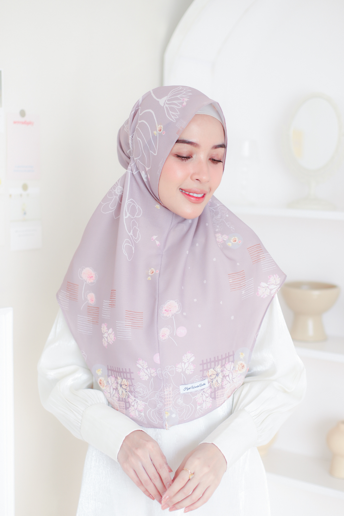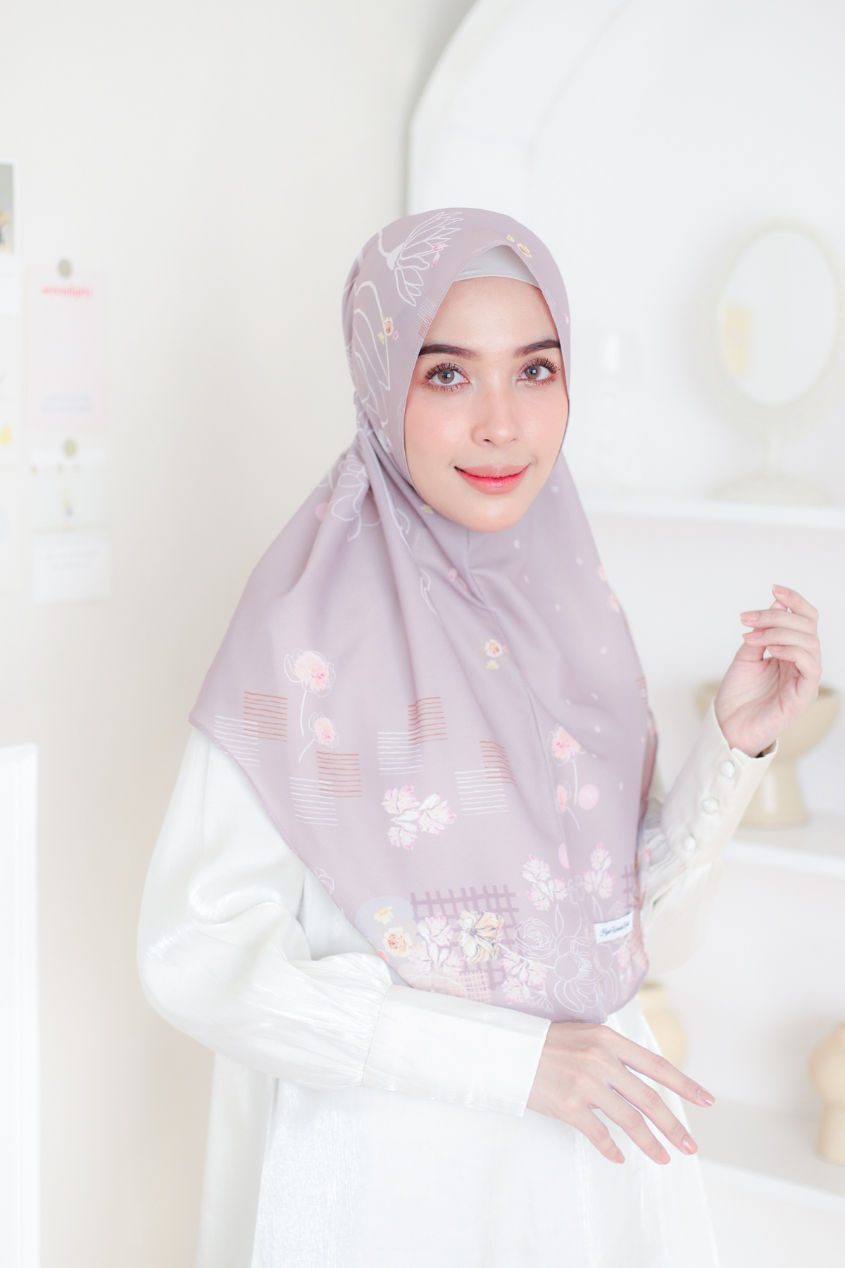 Hijab printing dengan motif Mora Series yang berarti manis, terinspirasi dari manis dan lembutnya cotton candy. Motif bunga-bunga berbentuk cotton candy memberi kesan manis, serta dipadu dengan ornamen bunga yang elegan.