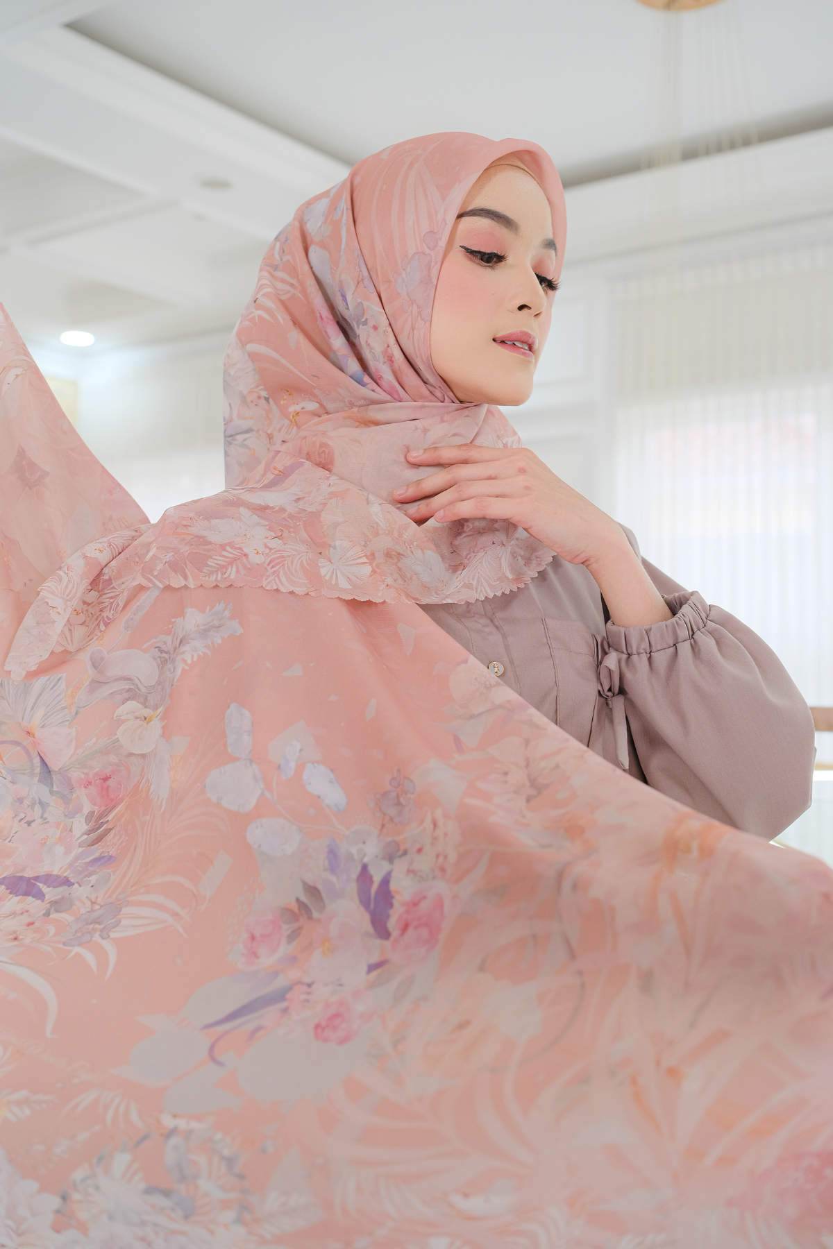 Hijab printing dengan motif exclusive Emily Series yang terinspirasi dari tema vintage garden yaitu nuansa keindahan bunga-bunga di taman dengan dekorasi klasik yang memukau. Dengan perpaduan warna-warna pastel yang lembut serta motif bunga yang sangat beragam menggambarkan rangkaian aneka bunga yang tertata cantik di taman. Pada bagian tengah scarf terdapat ornamen-ornamen abstrak dengan warna yang menyatu dengan warna dasar, sehingga memberi kesan clean dan elegan saat dipakai.