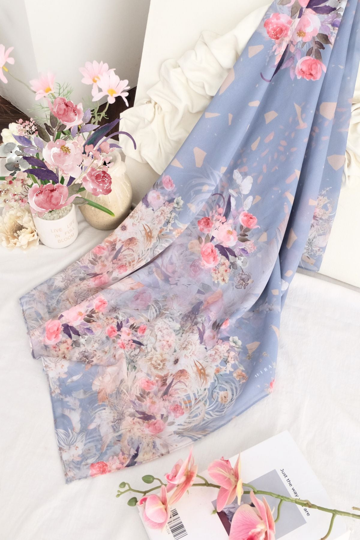 Hijab printing dengan motif exclusive Emily Series yang terinspirasi dari tema vintage garden yaitu nuansa keindahan bunga-bunga di taman dengan dekorasi klasik yang memukau. Dengan perpaduan warna-warna pastel yang lembut serta motif bunga yang sangat beragam menggambarkan rangkaian aneka bunga yang tertata cantik di taman. Pada bagian tengah scarf terdapat ornamen-ornamen abstrak dengan warna yang menyatu dengan warna dasar, sehingga memberi kesan clean dan elegan saat dipakai.