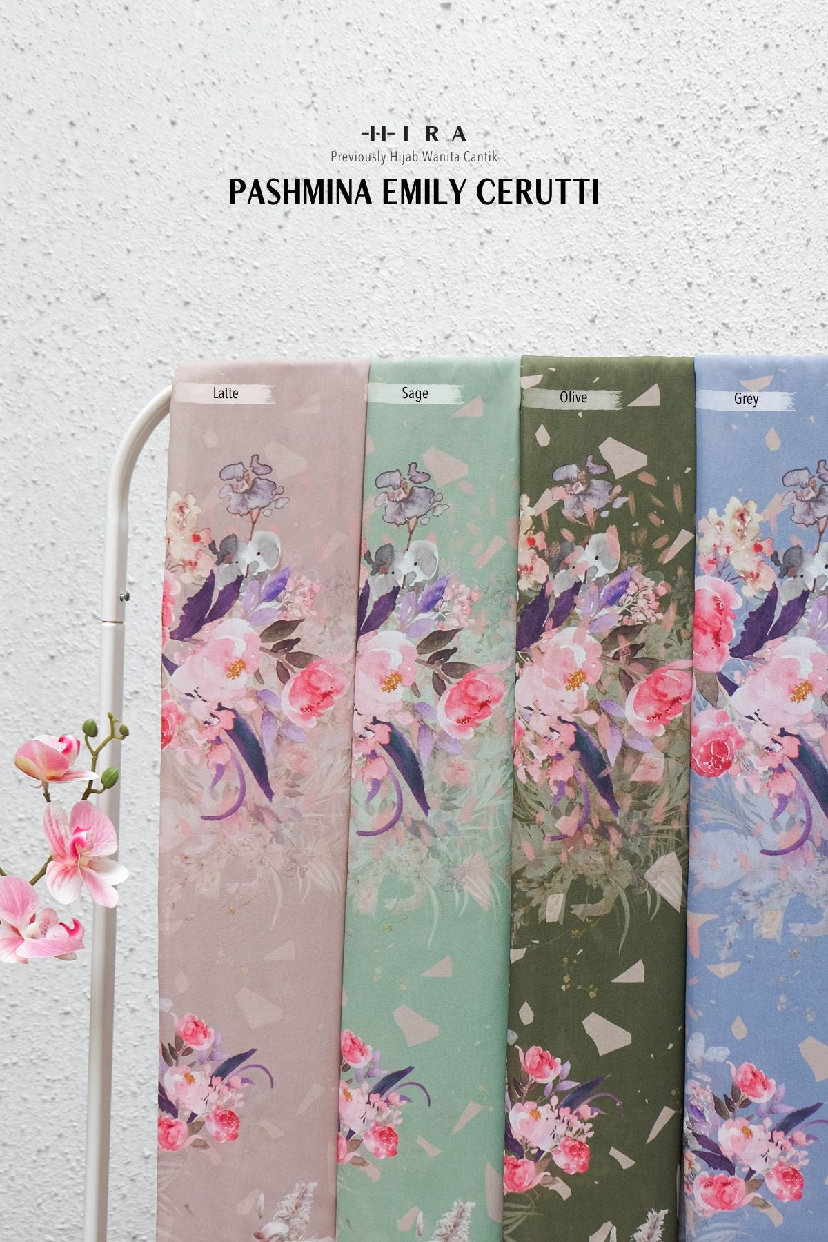 Hijab printing dengan motif exclusive Emily Series yang terinspirasi dari tema vintage garden yaitu nuansa keindahan bunga-bunga di taman dengan dekorasi klasik yang memukau. Dengan perpaduan warna-warna pastel yang lembut serta motif bunga yang sangat beragam menggambarkan rangkaian aneka bunga yang tertata cantik di taman. Pada bagian tengah scarf terdapat ornamen-ornamen abstrak dengan warna yang menyatu dengan warna dasar, sehingga memberi kesan clean dan elegan saat dipakai.