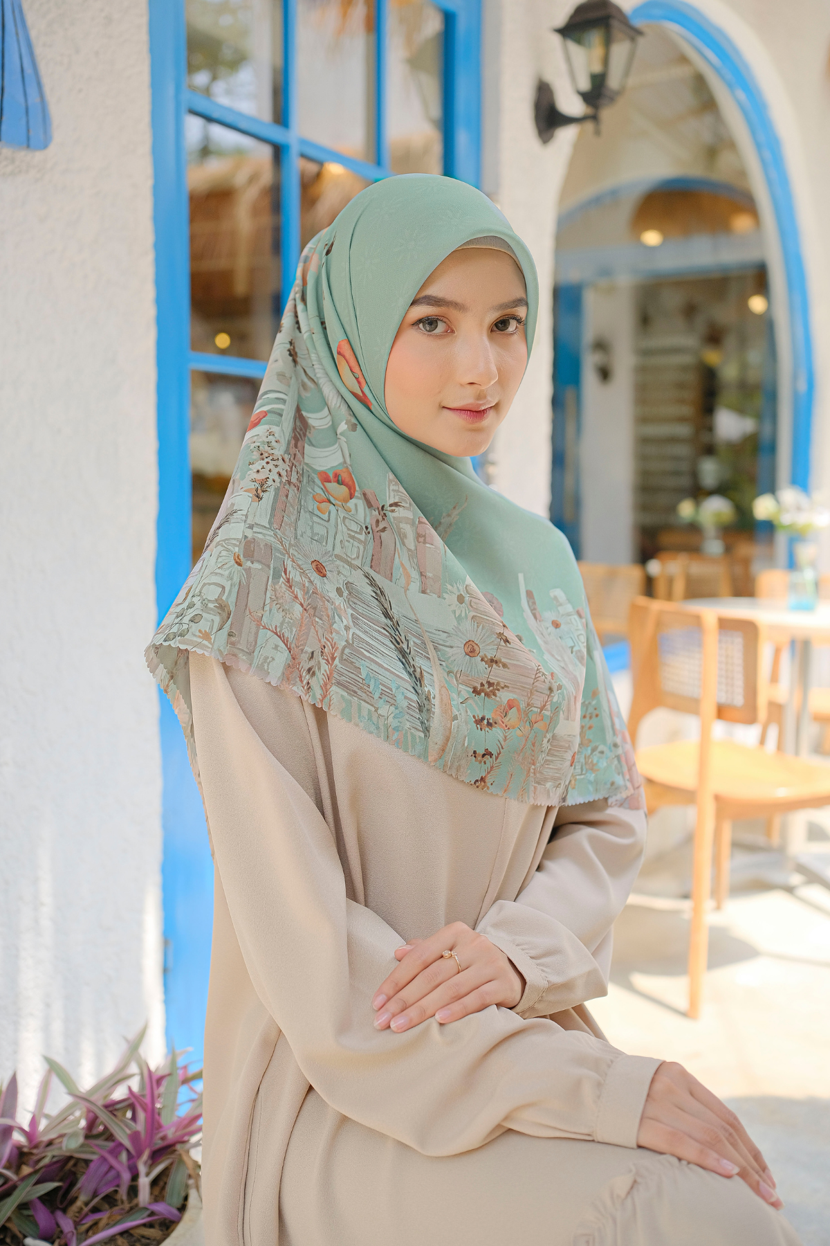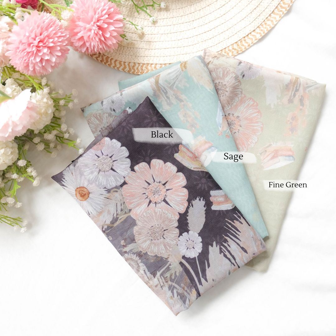 Scarf motif premium dengan desain exclusive yang terinspirasi dari bunga Zinnia atau bunga kertas, dipadu dengan nuansa buku-buku perpustakaan klasik yang memberi kesan warna-warna hangat dan menenangkan. Perpaduan motifnya cantik sekali, khas HIRA seperti lukisan